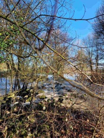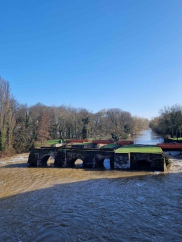Nous traversons l’ancien Pont Romain qui enjambe l’Huisne vers Le Plongeoir. Ador, artiste Nantais a élaboré en 2022 une fresque sur le mur de la Cité du Cirque ainsi que MioSHe qui lui a métamorphosé la façade en 2020.
