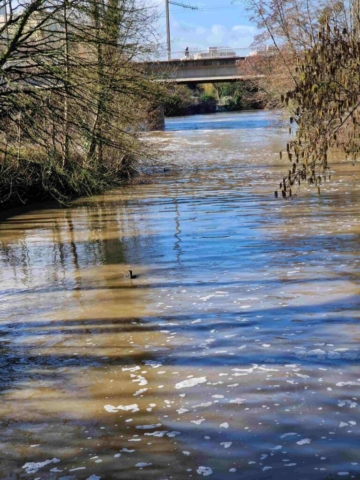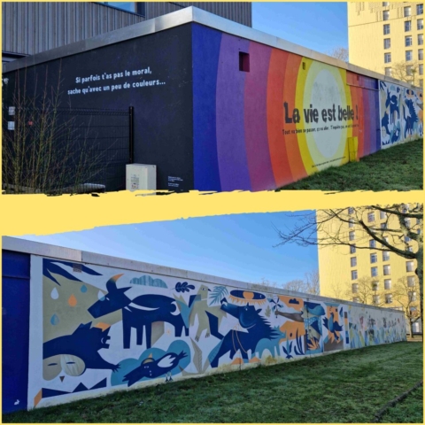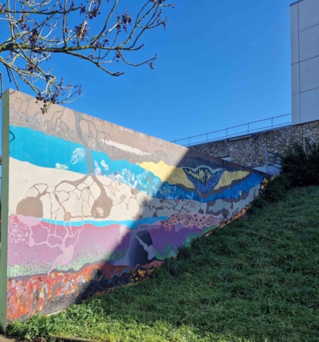 La première fresque apparaît sur les murs d’enceinte de la maison de l’eau. L’artiste, Nicolas Perruche, y a peint une réalisation de 50 m en noir et blanc qu’il a intitulé « Au bord de la rivière ».