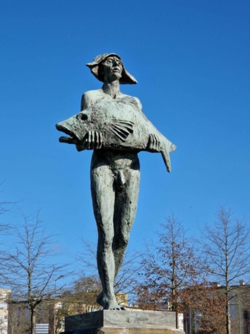 Poursuite le long de la promenade Newton où là une statue nous interpelle. Après quelques recherches, c’est un bronze de Roland Devolder, sculpteur de renom international. Cette sculpture « l’Homme et le Poisson » incarne l’aspect nourricier de la ville…