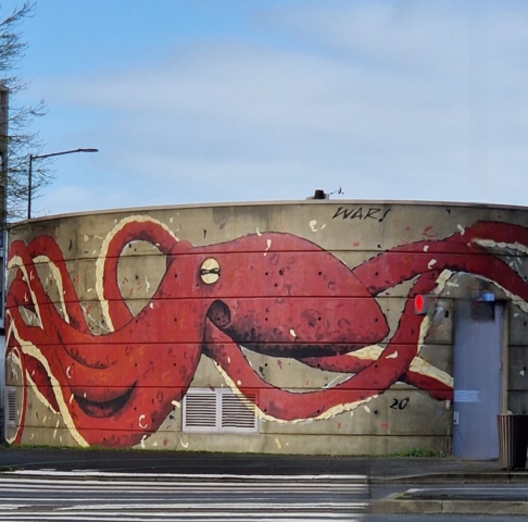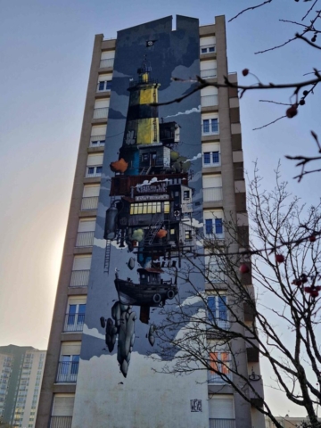 Nous empruntons des ruelles, des allées, traversons le parc « Le petit Bois » pour nous retrouver face à une magnifique fresque d’inspiration marine représentant un immense phare de Wen2 un artiste Brestois.