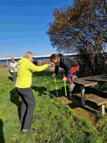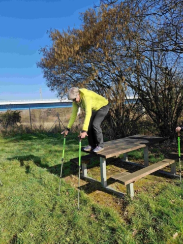Oh ! Belle aubaine : nous tombons sur une table de pique-nique. L’occasion de mettre à profit un exercice pour descendre un obstacle. Christine nous fait la démonstration, insiste sur le bon positionnement des mains et c’est parti…