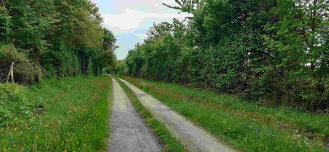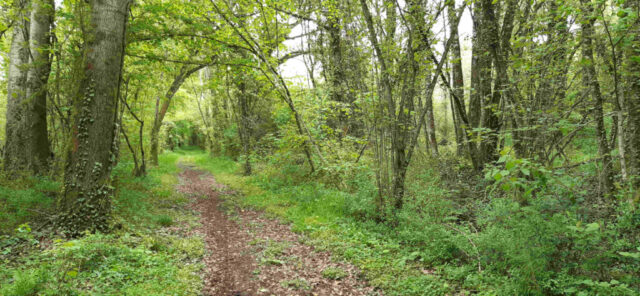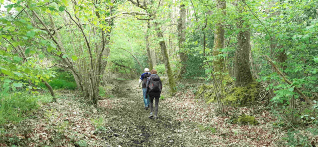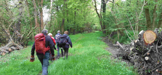 C’est par le GR65 que nous allons rejoindre Notre Dame du Pé. Sortie de Durtal sans intérêt mais s’ensuit un passage un peu humide, sentier creux verdoyant aux abords du bois du Grip, belle allée mi pierre mi terre pour arriver au pied de la belle grimpette qui nous mène au 1 er objectif pour la pause banane.