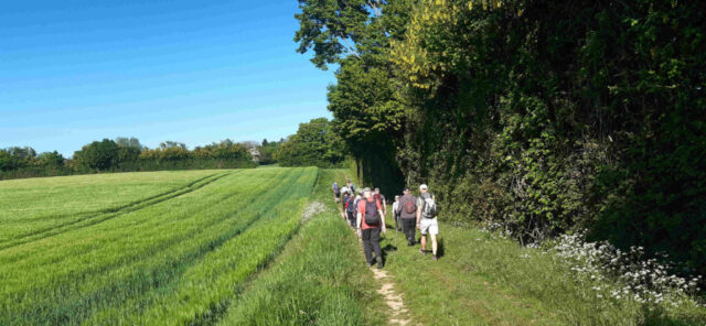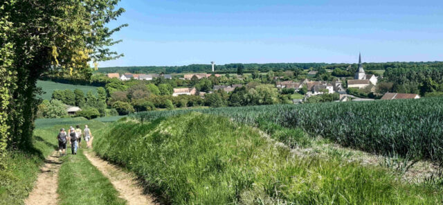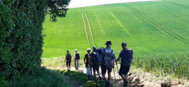 Après les festivités du jour, nous repartons à 23 pour remplir le contrat. C’est parti à nouveau sur le GR235 et son dénivelé du départ pour atteindre un plateau avec un magnifique panorama. On y admire ce patchwork de couleurs printanières, les petits vallons, l’ondulation de l’orge, c’est un régal pour les yeux. Nous voici à Suré. Direction le moulin de l’Aulne et son gué pour franchir l’Orne Saosnoise. Pas de bain de pied. Dernière montée au milieu des cultures pour terminer notre périple dans la joie et la bonne humeur comme d’habitude.