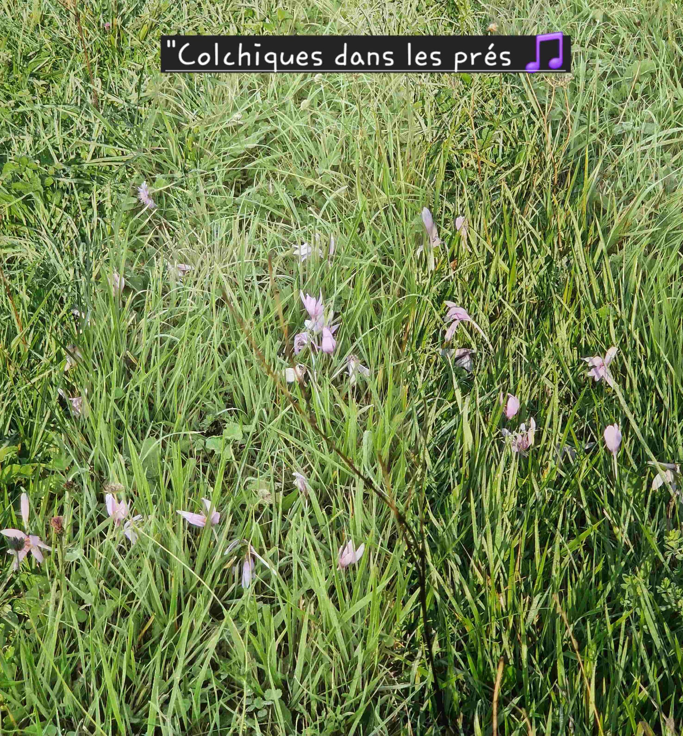 Nous nous engageons dans l’Espace Naturel Sensible du coteau des Buttes. Là paît tranquillement un troupeau de moutons surpris par tant de randonneurs. Puis nous tombons sur un tapis de petites fleurs violettes … des colchiques à ne pas confondre avec les crocus.