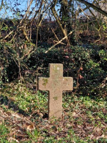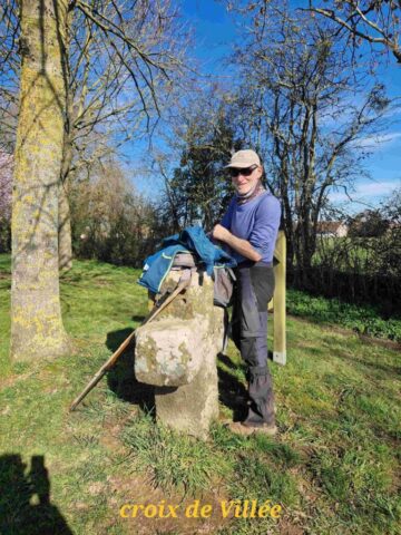 Puis encore de beaux sentiers à découvrir. Arrivée à la croix de Villée : « croix latine asymétrique en grès roussard, la plus ancienne de la commune. Elle est située sur l’ancienne voie antique reliant Vieux (près de Caen) au Mans. Au moyen-âge, cet itinéraire était emprunté par les pèlerins qui se rendaient à St Jacques de Compostelle ou au Mont St Michel ».