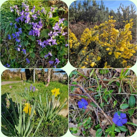 La campagne est radieuse sous ces rayons de soleil matinaux. Les petites fleurs printanières, jacinthes, violettes, jonquilles, aubépines … amènent déjà de jolies couleurs qui ravissent nos yeux et nos têtes.
