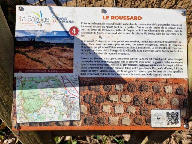 Nous passons devant la carrière de Roussard toujours en activité. « Le grès roussard, roche brune de couleur rouille, entre dans la construction de la plupart des maisons et bâtiments anciens du Nord-Ouest de la Sarthe »