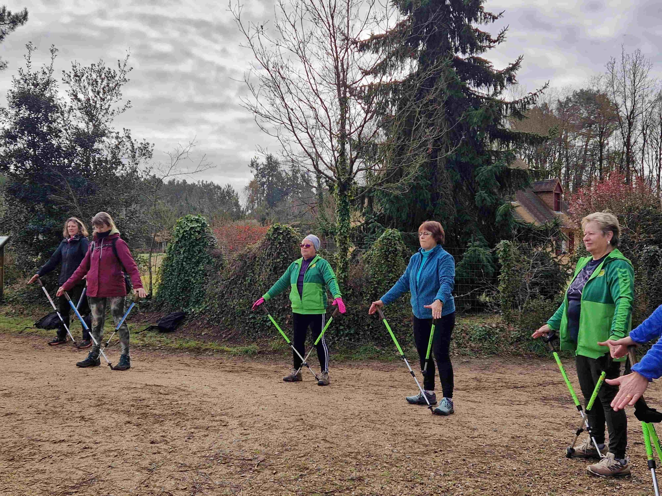 kiks avant, des fentes avec bâtons inclinés, des relevés de jambe, des kiks arrière. Beaucoup d’exercices synchronisés sur une musique entrainante qui donne le tempo et une parfaite harmonisation.